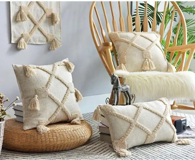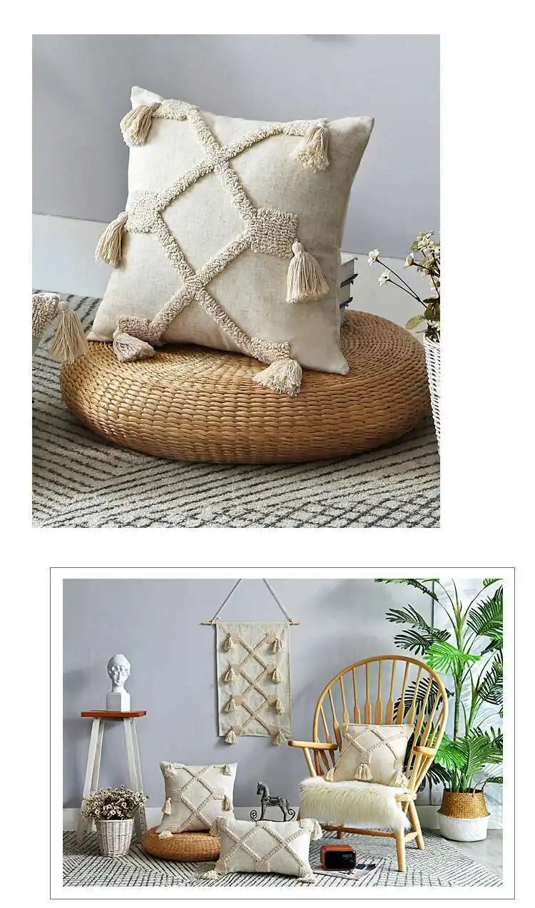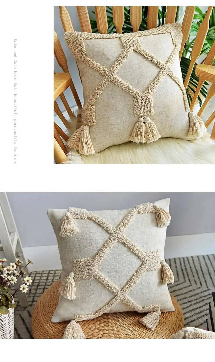 New Tufted technic,Soft and Durable. Geometric Pattern with Tassles decoration. Linen Fabric, Beige color. Simple, Natural and Stylish.