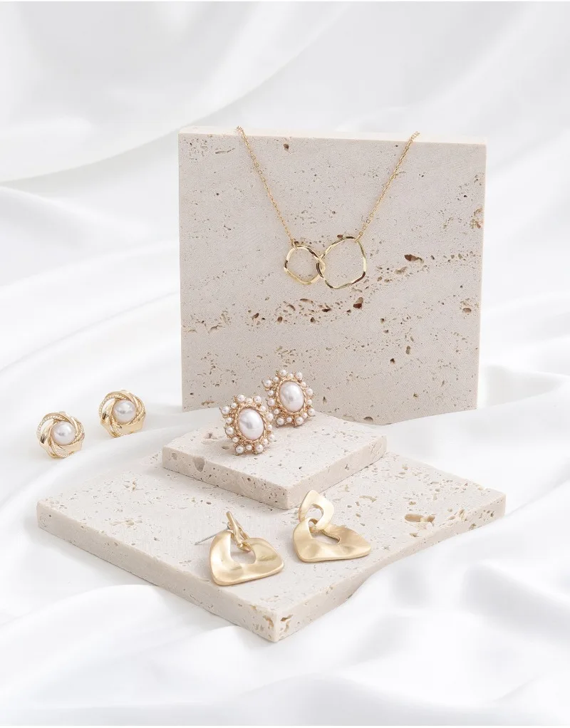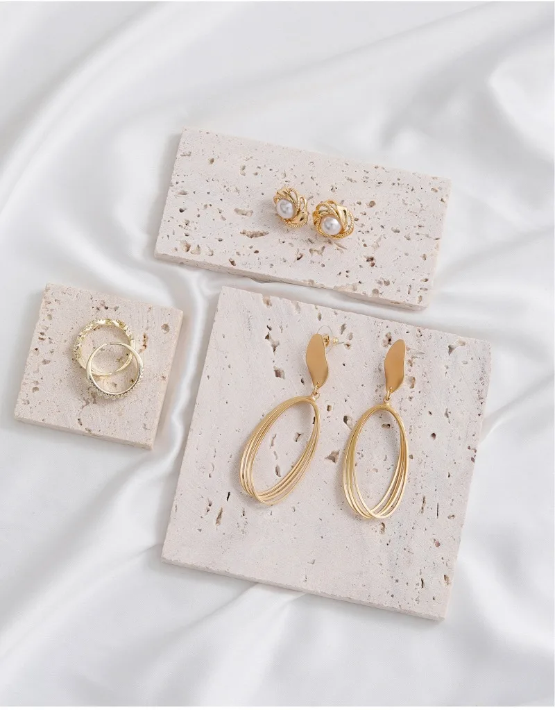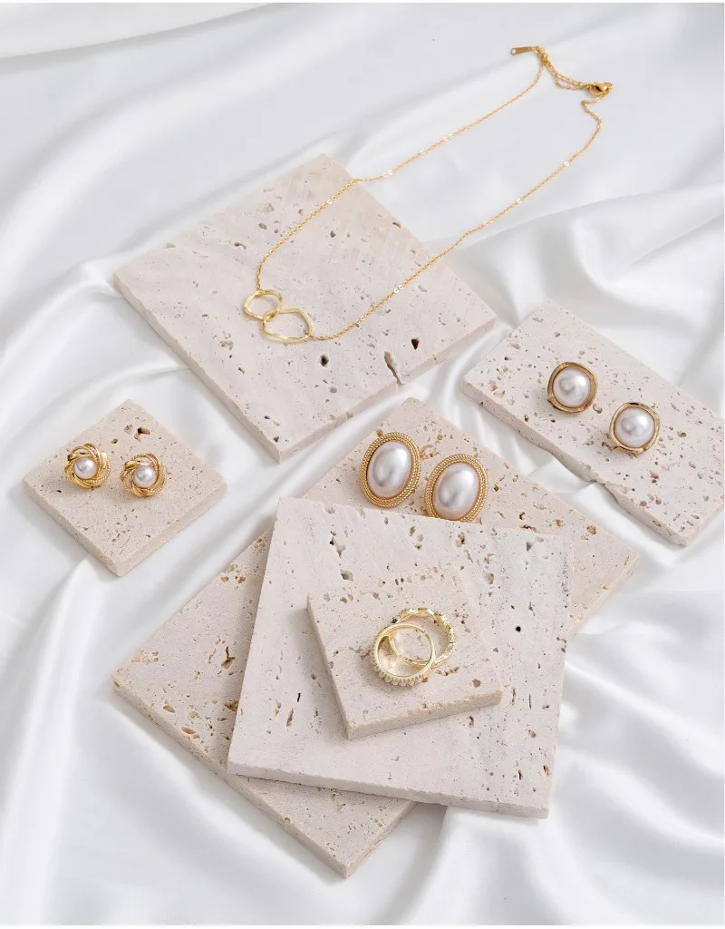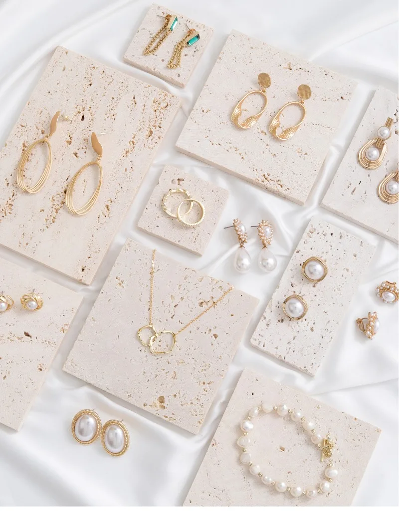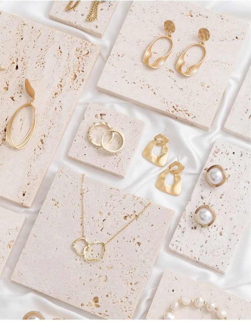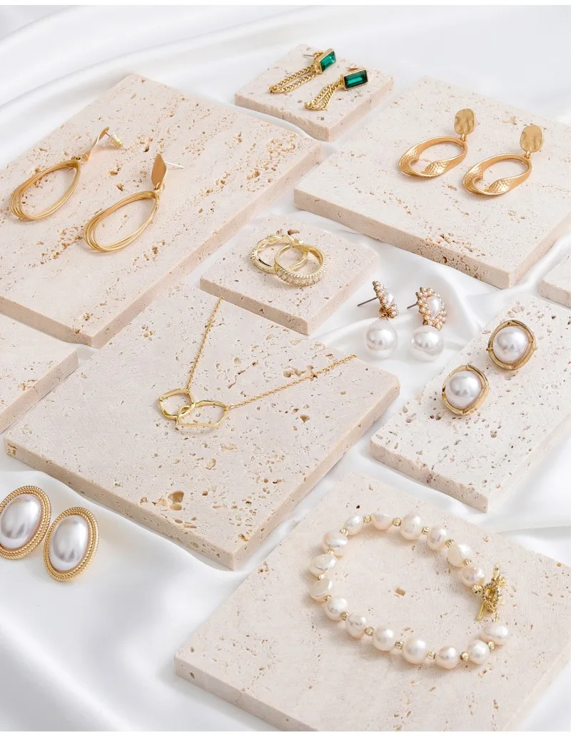 A mini travertine jewelry tray designed for earrings, bracelets, and necklaces. Ideal for vanities, dressers, and aesthetic flat-lay styling with a clean, modern look.