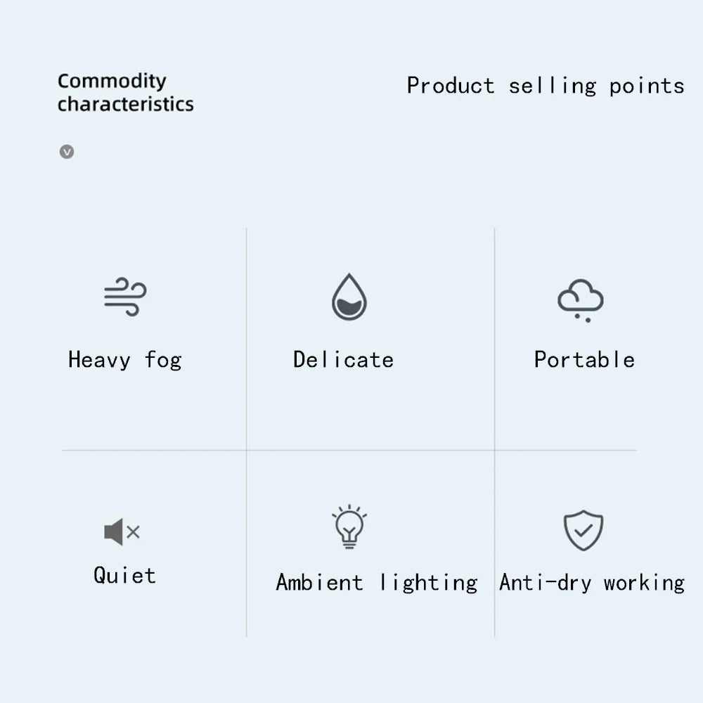 Care & Usage• Use with clean, room-temperature water only.• Add a few drops of water-soluble essential oils if desired.• Do not overfill the tank — follow the max fill line.• Empty and wipe the tank daily to prevent buildup.• Allow the unit to dry completely before storing.• Keep away from heat sources and direct sunlight.• Use only with the included USB power cable.